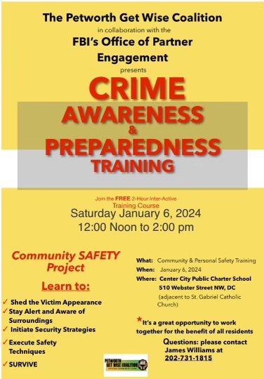 On Sat, Jan 6, I attended the Petworth Get Wise Coalition Crime (PGWCC) Awareness & Preparedness Training in collaboration with the FBI. There, I learned the best ways to protect oneself in an Active Shooter situation, how to protect yourself from physical harm while in a violent situation, and how to fight back and survive if attacked. It was outstanding training, and the FBI agents were incredibly kind, knowledgeable, and engaging. Thank you, PGWCC, for organizing this informative event.